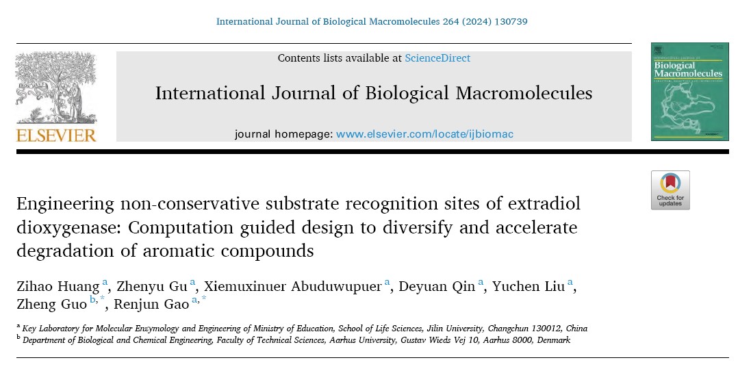 酚类是主要的环境污染物,外二醇双加氧酶是酚类降解的关键酶,高仁钧教授和郭诤教授团队合作,将前期筛选到的外二醇双加氧酶Tcu3516进行多序列比对,并将酶与底物进行分子对接。通过半理性设计手段获得了三突变体V186L/V212N/D285A,其催化性能及热稳定性均较野生酶有显著提高,可用于环境中邻苯二酚的降解。分子动力学模拟表明在三个突变位点的协同作用下,该酶获得了更稳定的核心及更灵活的活性腔入口,这为该酶的后续应用和进一步改造打下了基础。相关结果发表在International Journal of Biological Macromolecules,论文第一完成单位为黑料正能量