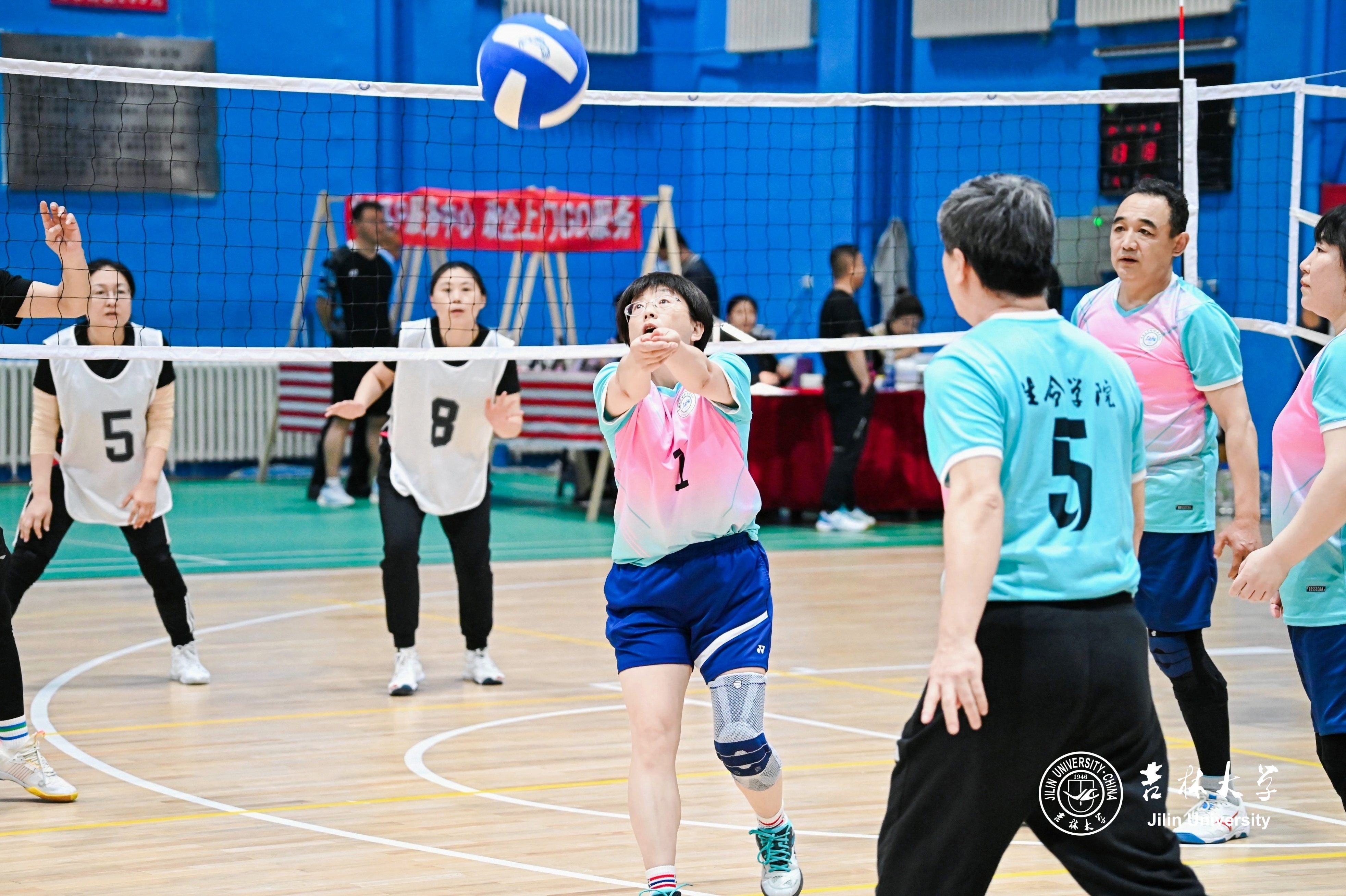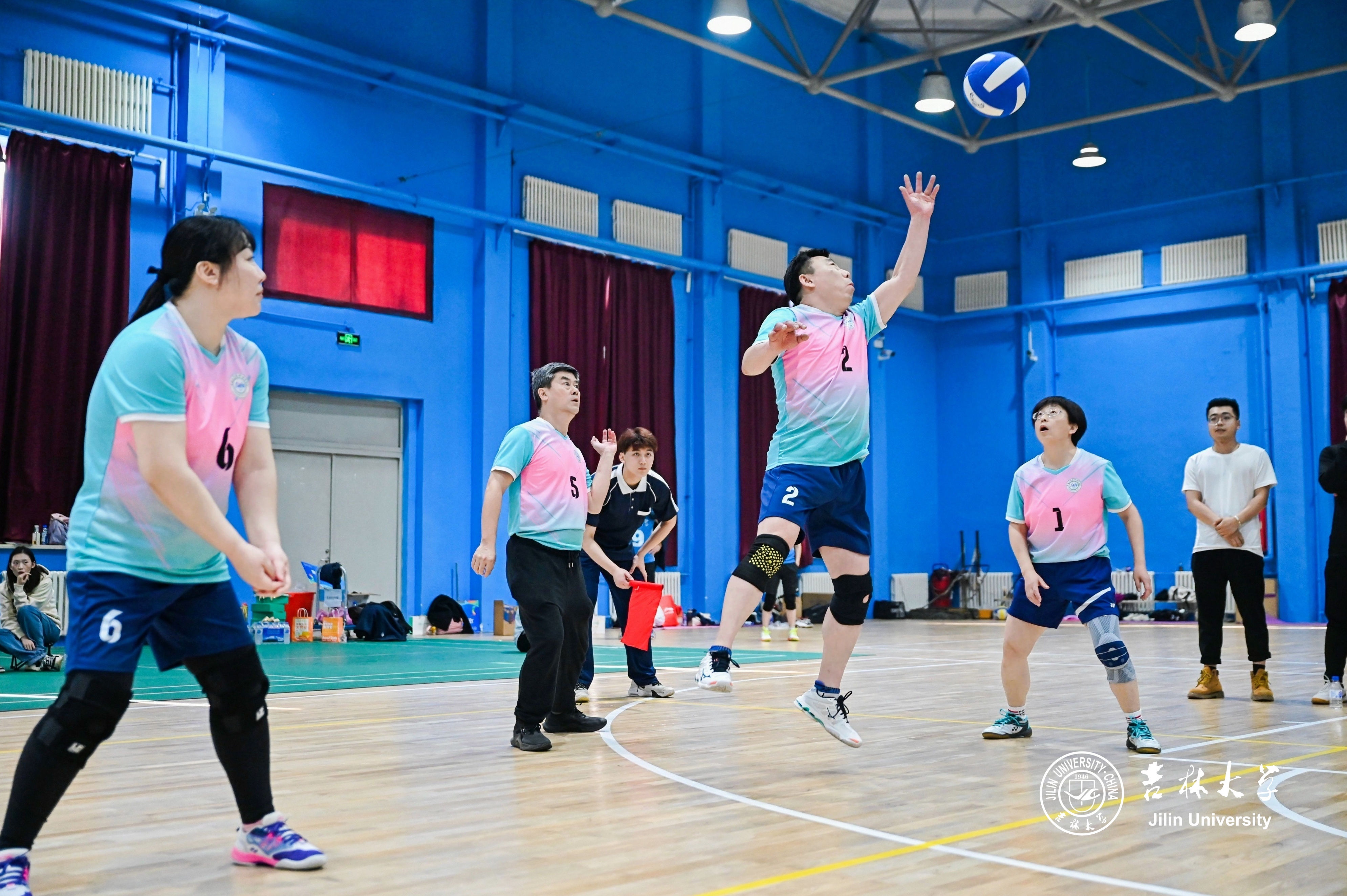 教师施维、吴永革、高波和孟令军斗志昂扬,技艺高超,每一次精彩的扣杀、巧妙的旋转球都赢得了现场观众的阵阵喝彩,展现卓越风采。