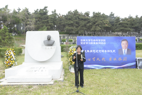 微生物学与免疫学系教工党支部书记单亚明代表教师发言 ,他说道“祭扫黄大年同志纪念碑,站在‘两个一百年’奋斗目标的历史交汇点上,作为党员,我们应当继续传承发扬黄大年老师心有大我、至诚报国的爱国情怀。教书育人、敢为人先的敬业精神,淡泊名利、甘于奉献的高尚情操。以‘只要祖国需要,我必全力以赴’的坚定勇气。迎接‘双一流建设’船到江心的关键期,应对祖国发展改革攻坚的发力期,勇担职责使命,不负时代重托。”
