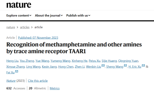 上海药物所副研究员王悦以共同第一作者的身份在国际著名学术期刊《自然》(Nature)上以“文章加速预览(Accelerated Article Preview,AAP)”形式在线发表了题为《Recognition of methamphetamine and other amines by trace amine receptor TAAR1》的最新研究成果(图一)。