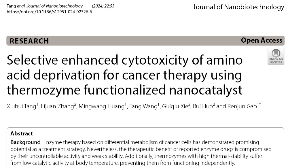 酶法治疗是很有潜力的癌症治疗策略,已报道的常温酶药物由于活性不可控、短半衰期等问题而使其治疗效果大打折扣。本课题组创造了一种新型的嗜热酶疗策略,用于乳腺癌的精准催化治疗:将嗜热精氨酸酶和天冬氨酸酶与纳米金和透明质酸偶联为纳米催化剂,靶向癌细胞后,用红外激光特异性激活嗜热酶消耗癌细胞内的氨基酸,诱发细胞凋亡,并协同光热治疗,有效杀伤了癌细胞。该疗法副作用小,范围可控,是一种有潜力的抗癌策略,相关结果发表在Journal of Nanobiotechnology,论文第一完成单位为黑料正能量