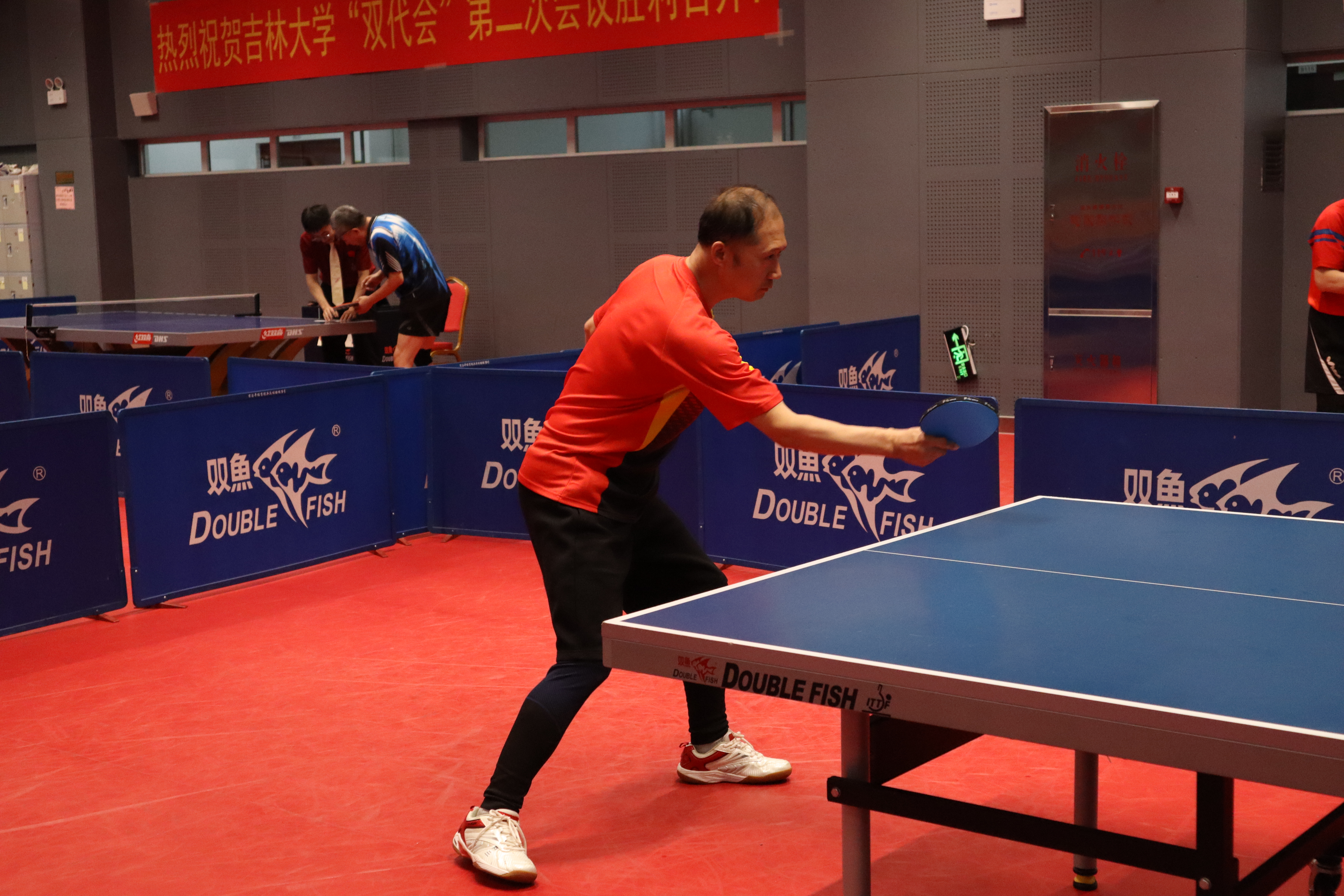 教师施维、吴永革、高波和孟令军斗志昂扬,技艺高超,每一次精彩的扣杀、巧妙的旋转球都赢得了现场观众的阵阵喝彩,展现卓越风采。