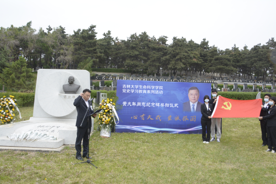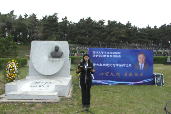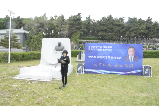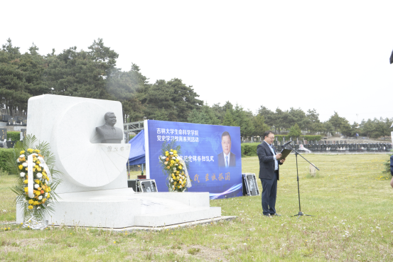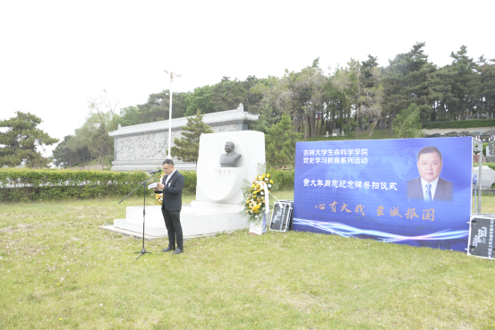 微生物学与免疫学系教工党支部书记单亚明代表教师发言 ,他说道“祭扫黄大年同志纪念碑,站在‘两个一百年’奋斗目标的历史交汇点上,作为党员,我们应当继续传承发扬黄大年老师心有大我、至诚报国的爱国情怀。教书育人、敢为人先的敬业精神,淡泊名利、甘于奉献的高尚情操。以‘只要祖国需要,我必全力以赴’的坚定勇气。迎接‘双一流建设’船到江心的关键期,应对祖国发展改革攻坚的发力期,勇担职责使命,不负时代重托。”